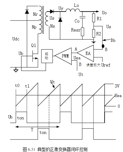 6.4.1?概述圖6.31為一個典型的正激變換器閉環調度的比如。能夠看出是一個負回響系統。PWM操控芯片中包含了過錯擴大器和PWM構成電路。操控芯片也供給許多其他的功能,但了解閉環安穩性問題,僅需考慮過錯擴大器和PWM。關于輸出電壓Uo緩慢或直流改動,閉環當然是安穩的。例如輸入電網或負載改動(干擾),引起Uo的改動,經R1和R2取樣(回響網絡),送到過錯擴大器EA的反相輸入端,再與加在EA同相輸入端的參閱電壓(輸入電壓)Uref比較。將引起EA的輸出直流電平Uea改動,再送入到脈沖寬度調制器PWM的輸入端A。在PWM中,直流電平Uea與輸入B端0~3V三角波Ut比較,發生一個矩形脈沖輸出,其寬度ton等于三角波初步時刻t0到PWM輸入B三角波與直流電平相交時刻t1。此脈沖寬度選擇了芯片中輸出晶體管導通時刻,一起也選擇了操控晶體管Q1的導通時刻。Udc的添加引起Uy的添加,因Uo=Uyton/T,Uo也隨之添加。Uo添加引起Us添加,并因而Uea的削減。從三角波初步到t1的ton相應削減,Uo恢復到它的初始值。當然,反之亦然。PWM發生的信號能夠從芯片的輸出晶體管發射極或集電極輸出,經電流擴大供給Q1基極驅動。但不論從那一點-發射極仍是集電極-輸出,有必要確保當Uo添加,要引起ton削減,即負回響。應當注意,大多數PWM芯片的輸出晶體管導通時刻是t0到t1。關于這樣的芯片,Us送到EA的反相輸入端,PWM信號假定驅動功率NPN晶體管基極(N溝道MOSFET的柵極),則芯片輸出晶體管應由發射極輸出。但是,在某些PWM芯片(TL494)中,它們的導通時刻是三角波Ut與直流電平(Uea)相交時刻到三角波中止時刻t2。關于這樣的芯片,假設驅動NPN晶體管,輸出晶體管導通(假設從芯片的輸出晶體管發射極輸出),這樣會隨晶體管導通時刻添加,使得Uo添加,這是正回響,而不是負回響。因而,TL494一類芯片,Us送到EA的同相輸入端,Uo添加使得導通時刻削減,就能夠選用芯片的輸出晶體管的發射極驅動。?圖6.31電路是負回響且低頻安穩。但在環路內,存在低電平噪音電壓和含有豐盛連續頻譜的瞬態電壓。這些重量經過輸出Lo,Co濾波器、過錯擴大器和Uea到Uy的PWM調節器引起增益改動和相移。在諧波重量中的一個重量,增益和相移或許導致正回響,而不再是負回響,在6.2.7節我們已議論過閉環振動的機理。以下就開關開關電源作加體分析。?6.4.2?環路增益?仍是來研討圖6.31正激變換器。假定回響環在B點-連接到過錯擴大器的反相輸入端斷開成開環。任何一次諧波重量的噪聲從B經過EA擴大到Uea,由Uea傳遞到電壓Uy的平均值,和從Uy的平均值經過Lo,Co回來到Bb(正好是從前環路斷開點)都有增益變化和相移。這便是6.2.7議論的環路增益信號通路。?假設假定某個頻率f1的信號在B注入到環路中,回到B的信號的幅值和相位被上面提到回路中的元件改動了。假設改動后的回來的信號與注入的信號相位準確相同,而且幅值等于注入信號,即滿意GH=-1。要是現在將環閉合(B連接到Bb),而且注入信號移開,電路將以頻率f1繼續振動。這個引起開端振動的f1是噪聲頻譜中的一個重量。?為抵達輸出電壓(或電流)的靜態精度,過錯擴大器必須有高增益。高增益就或許引起振動。過錯擴大器以外的傳遞函數一般無法改動,為避免參與過錯擴大器往后振動,一般經過改動過錯擴大器的頻率特性(校正網絡),使得環路頻率特性以-20dB/dec穿越,并有45°相位裕度,以抵達閉環的安穩。以下我們研討過錯擴大器以外的電路傳遞函數的頻率特性。帶有LC濾波電路的環路增益Gf?除了反激變換器(輸出濾波僅為輸出電容)外,這兒議論的全部拓撲都有輸出濾波器。一般濾波器設計時根據脈動電流為平均值(輸出電流)的20%選取濾波電感。根據容許輸出電壓紋波和脈動電流值以及電容的ESR選取輸出濾波電容。假設電解電容沒有ESR(最新產品),只按脈動電流和容許紋波電壓選取。由此取得輸出濾波器的諧振頻率,特征阻抗,ESR零點頻率。在頻率特性一節圖6.7示出了LC濾波器在不同負載下的幅頻和相頻特性。?為簡化議論,假定濾波器為臨界阻尼Ro=1.0Zo,帶有負載電阻的輸出LC濾波器的幅頻特性如圖6.32(a)中12345所示。此特性假定輸出電容的ESR為零。在低頻時,Xc>>XL,輸入信號不衰減,增益為1即0dB。在f0以上,每十倍頻Co阻抗以20dB削減,而Lo阻抗以20dB添加,使得增益變化斜率為-40dB/dec。當然在f0增益不是遽然轉變為-2斜率的。實際上在f0前增益曲線滑潤脫離0dB曲線,并在f0后不久漸近趨向-40dB/dec斜率。這兒為議論方便,增益曲線遽然轉向-40dB/dec。?假設使相應于Ro=1.0Zo條件下安穩,那么在其它負載也將安穩。但應研討電路在輕載(Ro>>1.0Zo)時的特性,因為在LC濾波器轉機頻率f=?f0增益諧振提高。