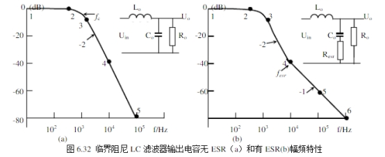 濾波電容有ESR的LC濾波器幅頻特性如圖6.35b的曲線123456。大多數濾波電容具有ESR。在f0以上的低頻段,容抗遠遠大于ESR,從Uo看到阻抗僅是容抗起首要作用,斜率仍為-40dB/dec;在更高頻時,esrRC<<ω1,從輸出端看的阻抗僅僅ESR,在此頻率規模,電路變為LR濾波,而不是LC濾波。即