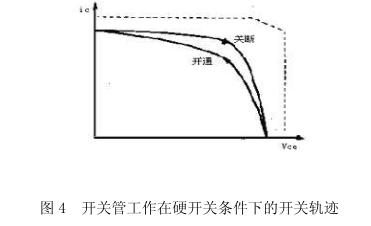 (d)二極管反向恢復問題:二極管由導通變為截止時存在著反向恢復期,在此期間內,二極管仍處于導通狀況,若當即注冊與其串聯的開關器件,簡單形成直流電源瞬間短路,產生很大的沖擊電流,輕則引起該開關器件和二極管耗急劇添加,重則致其損壞。圖4給出了接理性負載時,開關管作業在硬開關條件下的開關的開關軌跡,圖中虛線為雙極性晶體管的安全作業區(Safetyoperation area,SOA),假如不改善開關管的開關條件,其開關軌跡很可能會超出安全作業區,導致開關管的損壞。