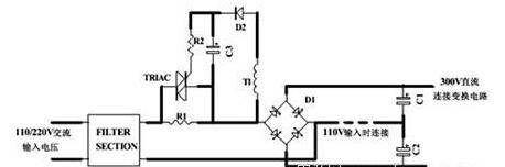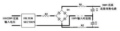 上圖所示為串聯電阻法沖擊電流操控電路(適用于橋式整流和倍壓電路,其沖擊電流相同),關于110V、220V雙電壓輸入電路,應該在R1和R2方位放兩個電阻,這樣在110V輸入銜接線銜接時和220V輸入銜接線斷開時的沖擊電流相同大。關于單輸入電壓電路,應該在R3方位放電阻。